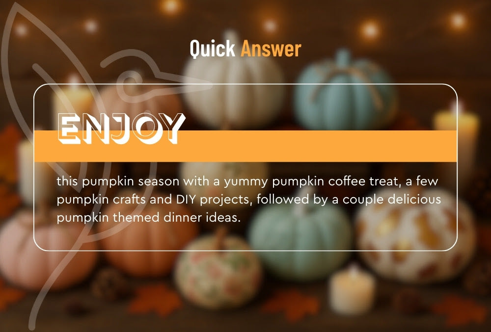 Enjoy this pumpkin season with a yummy pumpkin coffee treat, a few pumpkin crafts and DIY projects, followed by a couple delicious pumpkin themed dinner ideas.ย
